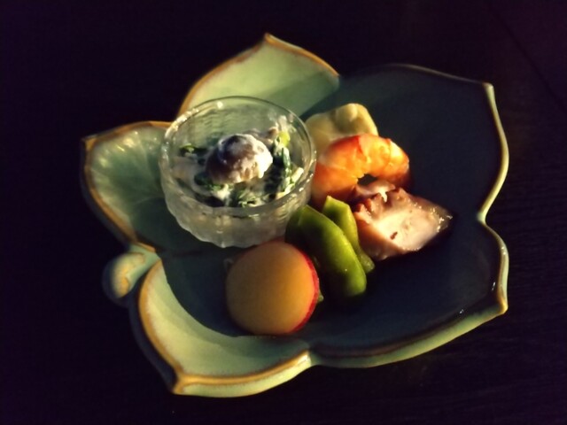 ○前菜 海老、蛸、枝豆、薩摩芋、白和え