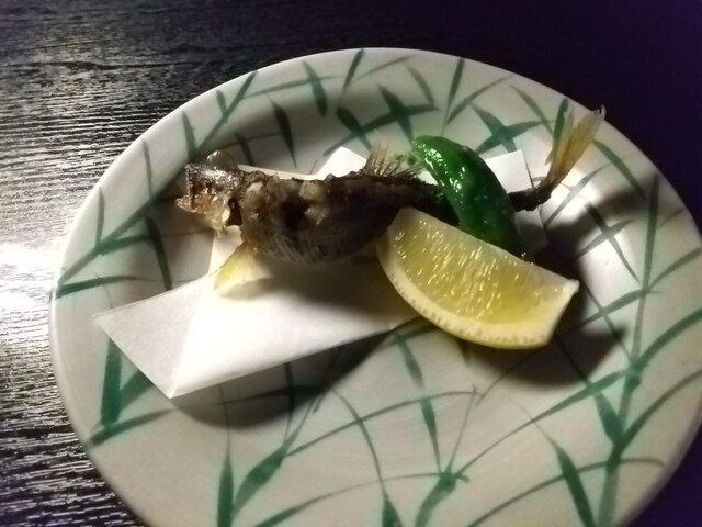 塩焼きに続いて、唐揚げの子持ちアユが登場。まさかの連続アユですが、塩焼きに感動して、もう一匹食べたいと思っていた所なので、思わず声が出る。完全にこちらの心が読まれています。しかも塩焼きではなく、唐揚げです。心憎いではないですか。塩焼きとは異なる味わいで、こちらも頭から尾まで完食です。美味しさは絶頂に達してきました。