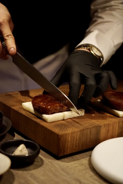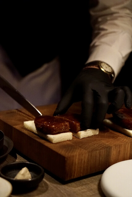 卵黄の立体感が凄く綺麗で濃度が凄い。簡単には潰れないであろう弾力、そこに降りかかる黒トリュフ。絡めたザブトンを一気に口に運ぶ、これは惚れる。