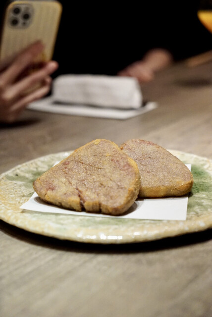ねっとりとした和牛を載せた生地のサクサク感、キャビアのプチプチと潰れていく食感、人を笑顔にする一品です。