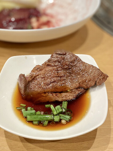 そして焼いて、いや正確にいうとここまで上質な肉を焼くステージにまだ自分は立ててないので焼いて頂きまして、食べさせて頂くんですけど、口に含んだ瞬間からこれまで食べてきた牛肉は和牛はなんだったんだと思うほどの香りとコクが口一杯に広がって、霜降りの脂のキツさを感じさせない相性抜群のタレがやはり次元が異なると再認識してきました。