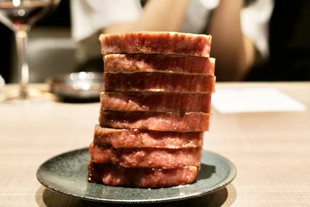 ヒレ肉は1個1個弱火でゆっくりと火入れをして遊び心ありきなタワーを作って貰えるというエンタメな調理工程。