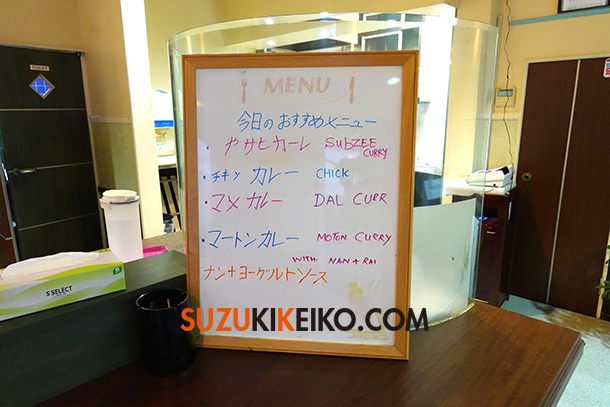 料理はカレー+ナンまたはロティ+ライタの3点セットで一律1100円。