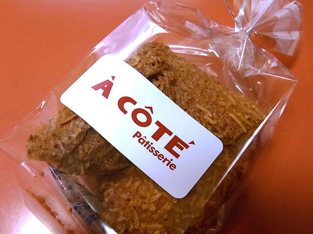 ア・コテ・パティスリーACOTEPATISSERIEin白金台<<作成日時:2010/01/3012:48ブログ気持玉0/トラックバック0/コメント01月30日(土)昨晩、突如襲われた悪寒から、39度を超える高熱を発しました。解熱剤で熱を下げ、今朝医者に診てもらったら、原因は不明、でも、少なくともインフルエンザではないとのこと。良かった体力消耗したからだを押してもどうしても行ってみたかった、白金台にある「ア・コテ・パティスリー」。食べログ「東京スイーツ2009」で、見事第2位に輝いた、シロガネーゼご用達?の焼菓子専門店。 ア・コテ・パティスリーACOTEPATISSERIE 東京都港区白金台2-5-11 TEL03-3447-1354 OPEN9:00〜13:00、15:00〜19:00(13:00〜15:00は準備時間) 日曜日定休、不定休(電話にて要確認) 東京メトロ南北線、都営三田線白金台駅より、八芳園方面、桑原坂をぐるっと下り、小さな交差点脇、徒歩6分ぐらい。 食べログ紹介ページはこちら看板がないと見逃すぐらい、住宅街になじんだ、フツーの一戸建て兼パティスリー。噂に聞いていた通り、人2人で満員御礼の1畳程度狭いスペース、厨房と会計、ショーケースが一体化した今まで見たことがないぐらいとてもユニークなコンセプトの店内。でもモダンで落ち着いて、白金のイメージ通りのいい感じのお店です。いろんな方のブログでは、増沢シェフは職人気質で、ゆえに気難しく、接客はイマイチという評判から、病み上がりのワタクシはいささか緊張してオーダーしましたが、ぜんぜんフツーに接客してくださいました。まぁ、特に余計な質問もなく、注文しただけだからかもしれないですが。到着したのは12時過ぎだったので、もう何も残ってないかなぁと危惧していたのですが、いろんな焼き菓子アイテムが並んでいました。焼き上がった直後だったのでしょうか。病を押して来た甲斐がありました!ラッキー気を良くして♪、焼菓子は普段生菓子ほど頂かないのですが、ついつい、買い過ぎてしまいました ケーク・オ・フリュイ 370円ラム酒がかなり利いた、ドライフルーツがふんだんに練りこまれた大人のケーキ。表面はサクッとしながらも、中はすごくしっとり。フォークを指したときの、やわらかさと固さが絶妙です。びっくりです。味ももちろん上等です。 フラン 320円エッグタルトにも似た、卵が濃厚なカスタードプリン的タルト。土台のクッキー生地はサクサクで香ばしく、濃厚カスタードの部分とのバランスも絶妙、とても上品で本格的エッグ?タルト。 木苺のガトーショコラ・ロレーヌ 390円薄いタルト生地の上に、うっすら甘酸っぱい木苺ジャムが敷かれ、表面はクッキーのようにサックサク、中身はほどよくしっとり、ワタクシは、濃厚すぎるショコラケーキは実はさほど好みではないのですが、これは好きです。コテコテし過ぎず、くどくなく、口当たり爽やか?なショコラケーキ。 ガトー・オ・マロン 380円フランス産のマロンを贅沢に使用した濃厚で素朴なマロンケーキ。個人的には、スイートポテトみたいな、素材の甘さが十分に引き出された、どこか懐かしい、ほっとする甘さ。見た目どっしり、密度が濃く重たいケーキかと思いきや、ホロホロ、ほどよく崩れて、想像以上にしっとりやわらかめ。これも絶品! チュイル・オ・ココ 1袋 560円さまざまなブロガーから賞賛の声が上がるこの「チュイル・オ・ココ」。いつもなら、クッキー系の焼き菓子は買わないのですが、思わず手を伸ばしてしまいました。ココナッツの超薄型クッキーです。ココナッツの食感、味もほどよく甘く香ばしく、確かにウマイ!皆様が絶賛するだけありました。ペロッと行きました。いやいや、評判通りの上等で食べやすい、極上のスイーツでした。こんなに焼き菓子を一気に頂いてもまったく後味くどくなく、重くなく、ほどよい満腹感。スバラシイです。価格も、人気店ではありえないぐらい、リーズナブル。良心的でうれしい。また別のアイテムも是非試してみたいですね。で、恒例のパッケージは、過剰な包装はない、エコなパッケージ。これはこれで好感度高し。妙にきどりすぎるよりも、全然よいです。アットホームでいい感じですね。最後に、バレンタインも近いということで、バレンタイン限定の、「オペラ」ケーキみたいです。もらえる方は羨ましいですね。きっと、抜群においしいでしょう。というわけで、エナジー補給により、だいぶ体調も良くなりました期待以上の極上スイーツに出会えて光栄ですご馳走様でした。合掌