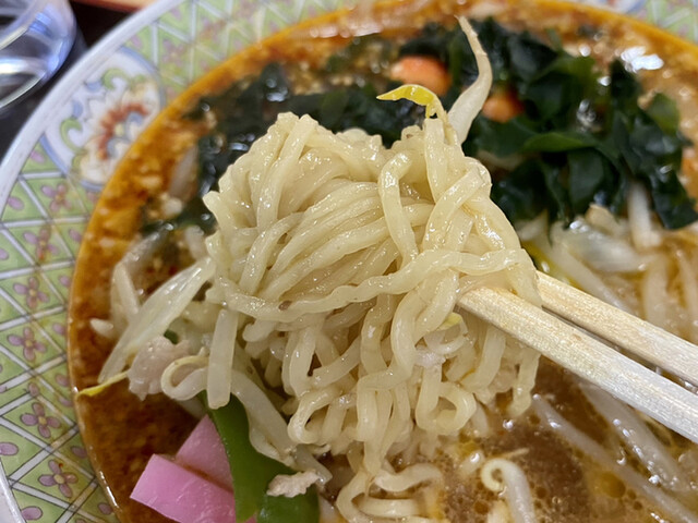 辛さを彷彿とさせる赤みあるスープに沈む縮れ麺と、その上に散らばる緑黄色野菜の数々とカマボコ2切れ。ピーマン、人参、キャベツ、もやし、玉ねぎと、シャクシャクとした野菜食感が残っており、タンタンメンと言えど、今風のものではなく、昔ながらの昭和のピリ辛ラーメンという印象か。
