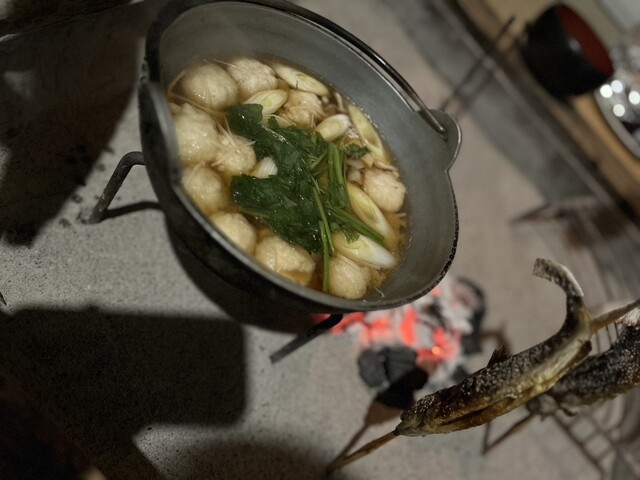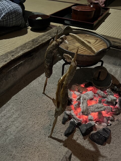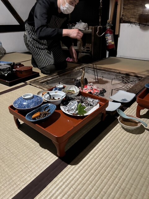 夕餉は囲炉裏を囲んで供される郷土料理。