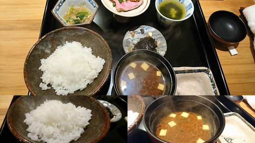 それを食べている間にお米が炊き上がりお茶碗によそわれて赤だしと共に出てきました。