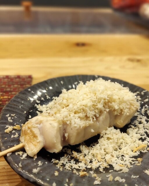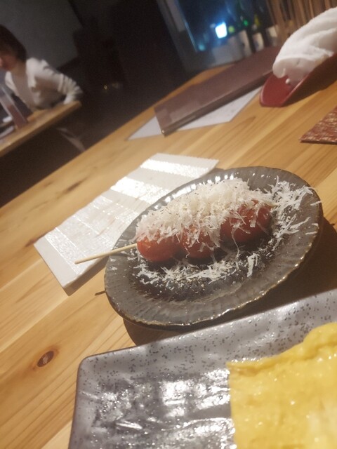 チーズつくねもでかい、美味しい。パルミジャーノ・レッジャーノうまーいね!ミニトマト串にもたっぷりチーズ最高!