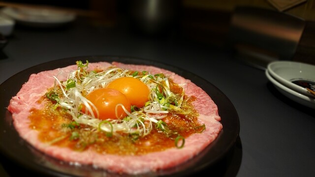 続いて主役級前菜 赤よりのオレンジに輝く生卵を冠して届いたはカルパッチョ。甘じょっぱくガーリッキーで背徳感の塊のような一品。鼻血出そうになったが平静を装い食べ進める。