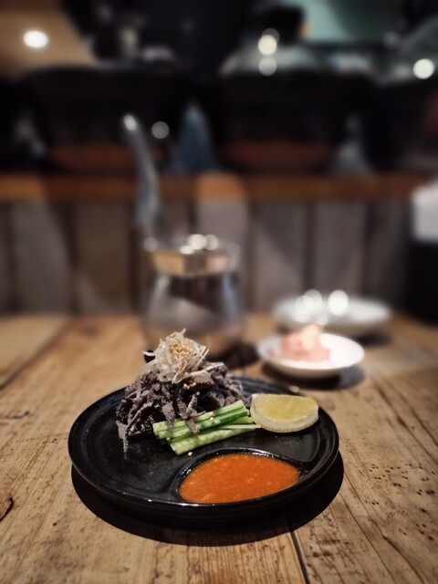 ミノを昆布醤油に漬けて、薄造りにしたもの。無限に食べて飲み続けられるこいつは呑兵衛殺しと言っても過言ではない。ついつい飲みすぎちゃう♪
