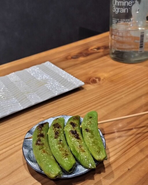 本日のお勧め【スナップえんどうと、アスパラ串】素材の良さ伝わるみずみずしさ。焼きも絶妙。