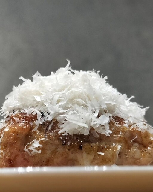 【鬼おろし&雪見つくね】はこちらのマスト!粗めの挽き肉が食べ応えあるごろっとしたつくねに歯ごたえ良い鬼おろし、美しく削り立てのパルミジャーノが雪のごとく、どちらも旨い!