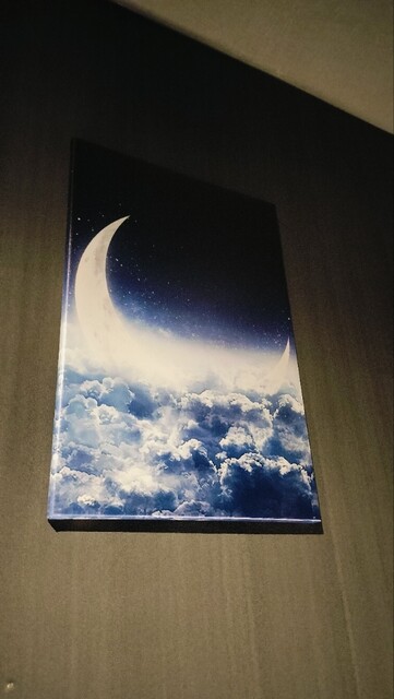 落ち着く個室には青い空と三日月のオブジェ。のんびり、おいしいものを食べ、酒を飲む。
