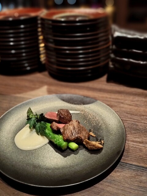 マッシュポテトにアスパラ添えで、ブラックオリーブのソースが独特。それぞれ肉の旨味、味わい。酒がすすむ。