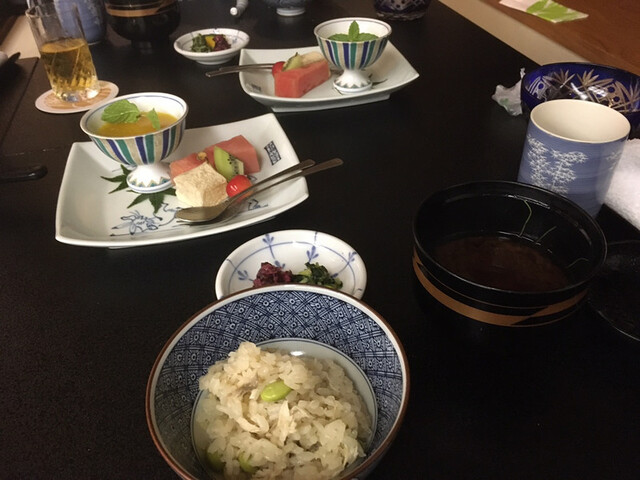 嵐山梅雨明け早々、GoToトラベルが始まる前にっってコトで、旦那様と二人で 京都嵐山へ一泊旅行 お宿は、渡月橋の南詰に 趣ある風情で佇む 渡月亭。食事処の松風閣、川沿いの碧川閣、そして2012年に一部のお部屋をリニューアルされた「月」をテーマに創られた秀山閣。 その中で案内されたのは、秀山閣の2階の一番奥(=渡月橋に近い)名古曽という10畳のお部屋。 露天ではないけれど、広々とした天然温泉の個室風呂付のお部屋。木の香り漂う、癒される空間です。 個室の蛇口からは天然温泉が湧き出ていますが、大浴場のお湯はさらにトロットロでめちゃめちゃ美肌の湯!! 何度も入浴して、帰る頃には 湯あたり一歩手前。。。。。 チェックインの16時より半時間(30分)ほど 早かったけれど、すんなりとお部屋へ案内されまして。 お抹茶と乾菓子で一服 あぁ~、京都だよね 浴衣は着替えも含めて、2着/人用意されていて、 色浴衣は可愛い(&格好いい)モノで、そのまま散歩へ出歩きました さてさて、食事(夕・朝)は、碧川閣の大広間にて。 川沿いに建つ建物の1階からは、川の様子を…この日は 上流で大雨だったので 濁流ですが・・・。 眺めながらの食事が楽しめます 初夏のお献立。まずは 前菜。胡麻豆腐(中央)にはキャビアがのってますビール(\880-)で乾杯 向付(=奥)は、お造り。鯛、ハモなど、白身が3種。 鱧に、枝豆 などなど、季節の食材で始まり、、、 お吸い物も お上品。ひんやり煮物も お出汁がGood 鮎を蓼酢で頂くなんて、初めて。。。。。 釜めしは、オコゲまで美味しくいただきました。 早朝(4時)の渡月橋 さすがに人っ子一人おらず、向こうに見える山際が美しい 朝食では、湯豆腐を頂きましたよ! 嵐山と言えば、お豆腐ですよね!小鉢も美味しかったけど、やっぱ 湯豆腐が一番美味しかった あー、贅沢な日常を過ごさせていただきました。また、機会があれば、行きたい1軒になりました。