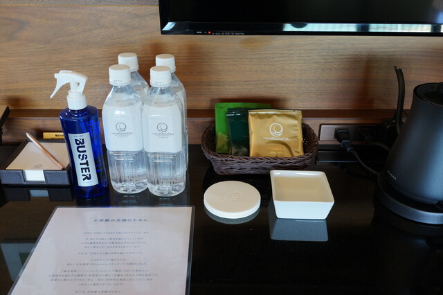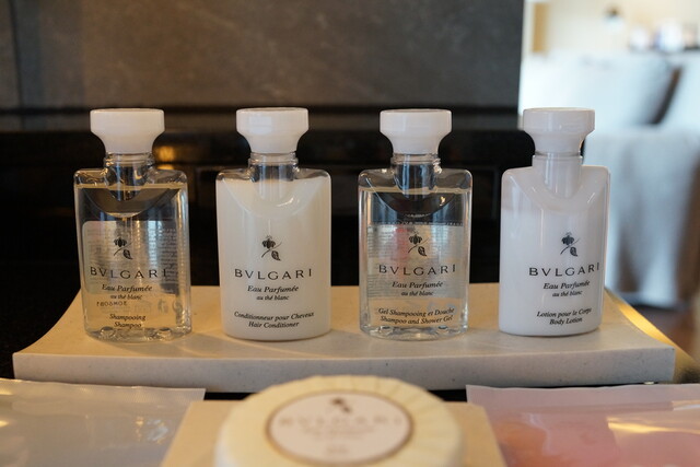 バレーサービス&ターンダウン。アメニティはブルガリ。冷蔵庫の無料ドリンクは種類豊富で「アランミリア」という美味しい高級ジュース2本つき。