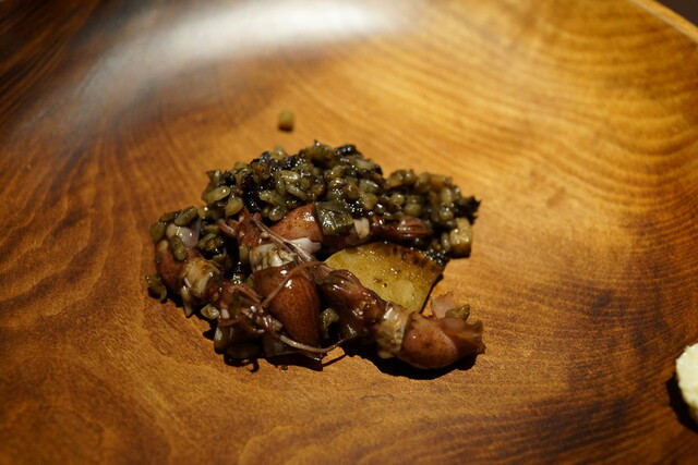 「蛍イカとイカ墨のパエリア」は大量の蛍イカが入ってます。濃厚な旨味のかたまり。タケノコ入り。仕上げに炭の香りを上からつけてました。余ったらお土産で持ち帰り可。冷めても美味しかった。