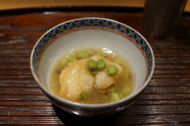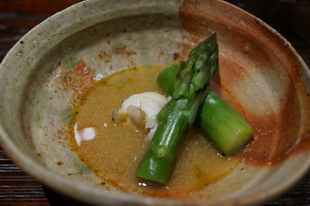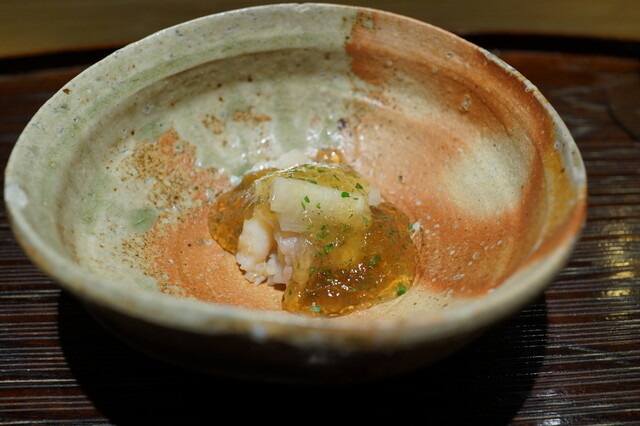 「海老/アスパラ/雲丹」は正統派日本料理ですごく美味しかった。高品質な素材はもちろん、酸味あるジュレ&やや甘いソースが旨味を引き立てて最高。