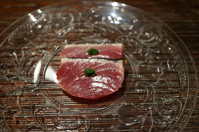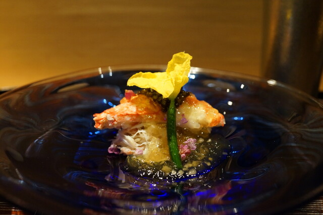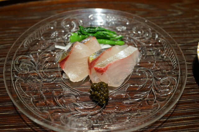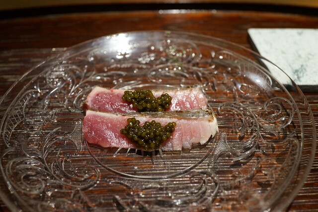 「海老/雲丹/アスパラ」「シマアジ?with燻製キャビア」