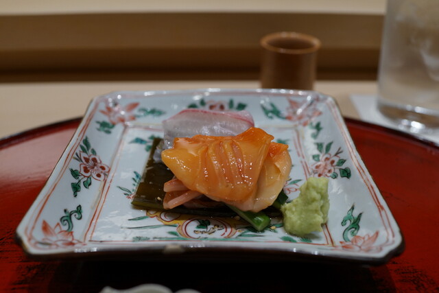 「鯛と赤貝のお造り。あん肝ソース」 あん肝は甘さ控えめで上品。