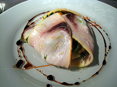 前菜はキャベツのスペシャリテ、鯖のカルパッチョが美味。