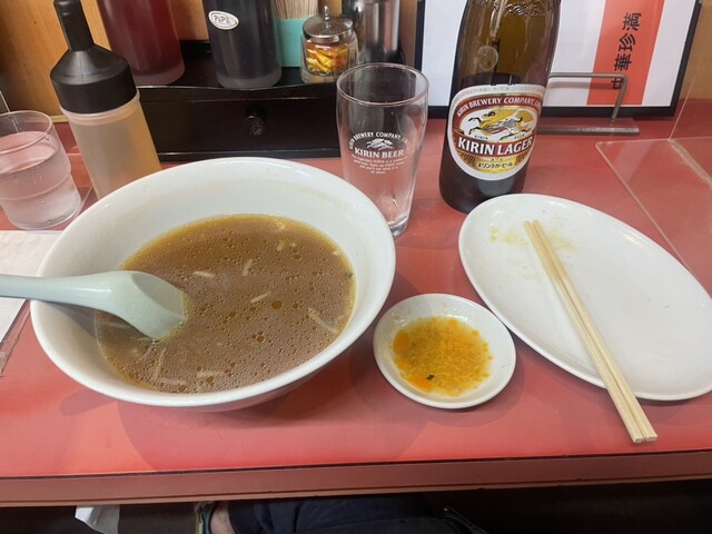 入店してしばらくすると名物の餃子が運ばれてきた。ファーストインプレッションは「デカい!」だった。早速、餃子を食すと、百名店に選出される理由が分かる美味しさだった。職人に丁寧に焼きあげられた外皮は「パリっ」と「もっちり」が絶妙。何より餡が最高なのだ。極限まで細かくみじん切りされたキャベツが口入れた時に広がり、あまり食べことない餃子に感じた。それにビールとベストマッチ(死語?)なのだ。餃子を半分食べたところで、検討リストに無かった「もやし麺(690円)」を注文した。吉野家ばりに直ぐに「もやし麺」が運ばれてきてスープを啜る。生姜が効いているどこか懐かしい味で、これまた美味。それに「ラーメンに野菜炒めが乗っかっている」感じでボリューミー。