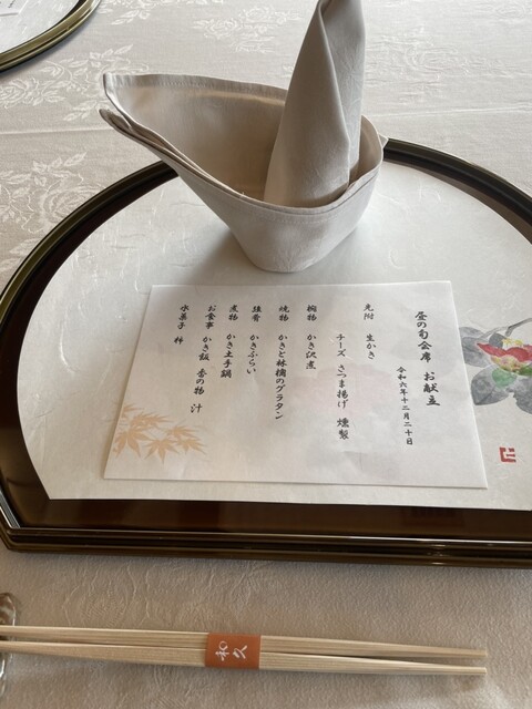 生殻牡蠣、先付け、椀もの、カキと林檎のグラタン、カキフライ、土手鍋、牡蠣飯と「一年分の牡蠣を堪能した❣️」という気持ちなった。
