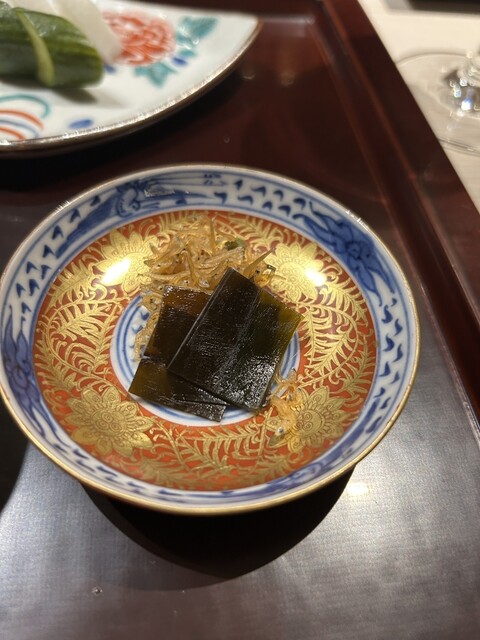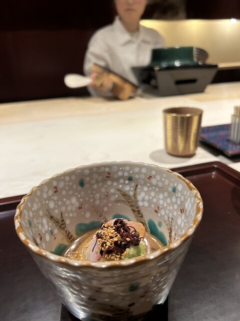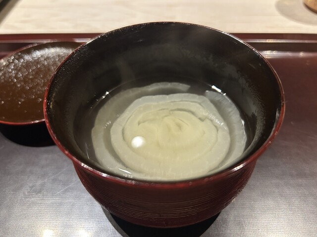 淡路島の新玉ねぎのスープはお出汁とお塩のみだそう。(ここら辺から緊張もほぐれ、大将のお話ししながら。カウンター席で最初緊張しちゃった)
