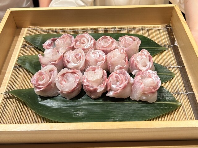 漬けの真鯛が並べられたお皿はまるで絵画のよう。こちらが握りに!悶絶ものです!