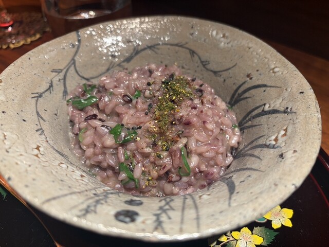 古代米のリゾットには上品な湯葉と京都の山椒が添えられ、香りと食感のバランスが印象的。