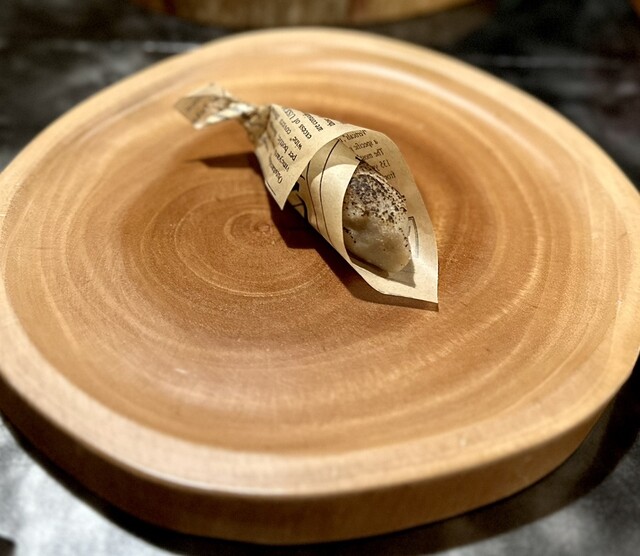 なんじゃこの器は切り株か!木の器がなんとも見て触って楽しい。