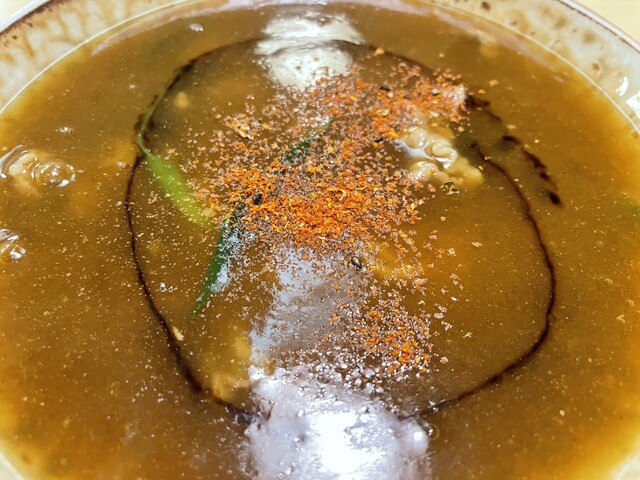 餡かけそばのお出汁がベースで、風味付けにカレーが使われていると推測。和風出汁のお味の根底にカレーの辛味が沈んでいる感じです。スパイシーなのにおそばの風味を邪魔しないお出汁は大変美味しかったです。