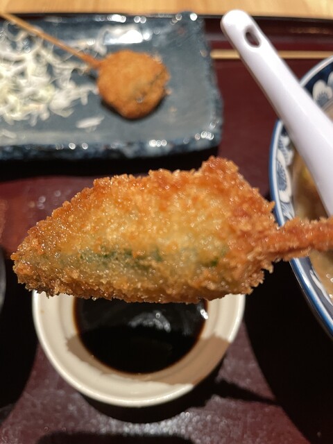 野菜串カツはレンコン・オクラ・かぼちゃをウスターソースに付けていただきました。3種類の食感が楽しめるのでこちらもお勧めです。