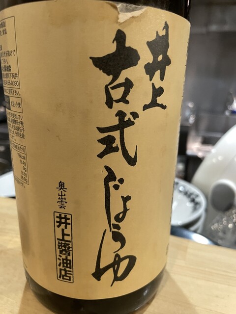 ビールを飲みながらカウンター上に置いてあったお醤油の瓶を観察。こちらの醤油ダレは奥出雲の井上醤油店の「古式しょうゆ」を使っているようです。店内での販売はありませんでした。