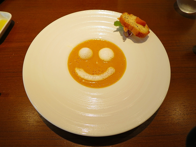 FrenchHana(フレンチ ハナ)@大阪市北区曽根崎公開2014年12月10日(水)お昼のランチ時ですねこの日はこちらへ御邪魔しました以前からずーっと行ってみたいお店でした♪では早速店内へ~♪当日に予約しておきましたのでリザーブ席ですねw先ずはお水で・・・そして前菜は「サーモンの軽い燻製のマリネ」♪うまー♪サーモンの燻製がこんなに甘く感じるのは初めてで御座います♪wwそしてパン更にこれまたエエ感じのバターとオリーブオイル♪繊細で綺麗~♪本日のスープ「北海道産栗かぼちゃのスープ」うまー♪こちらのお皿はウィンクしてありますね♪お次はメインですね淡路産白身のお魚のポアレうまー♪うまー♪こちらはメイン2「フランス産ほろほろ鶏のロースト」これまたうまー♪こちらはデザートですね♪「リンゴのケーキにバニラアイス添えぶどうのコンポート」こちらではパティシエがデザートをタンとうして下さっている様です♪うまー♪〆は珈琲と紅茶ですね♪大変美味しく頂きました食後少しだけシェフとお話しする時間がありましたので実は○○さんの御紹介で~♪と「○○君元気ですか~」って感じで御座いました♪御馳走様♪