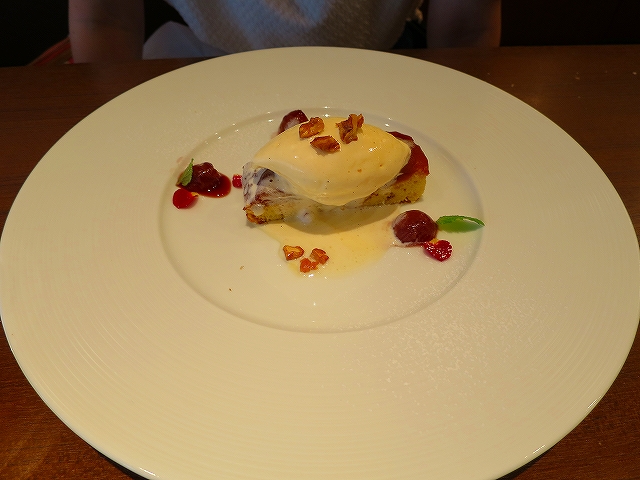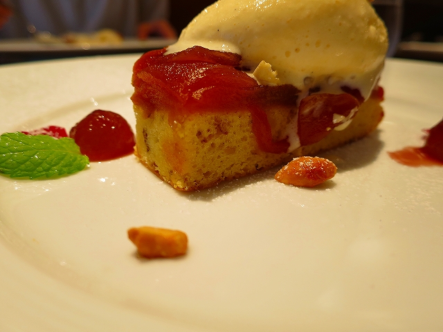 「リンゴのケーキにバニラアイス添えぶどうのコンポート」