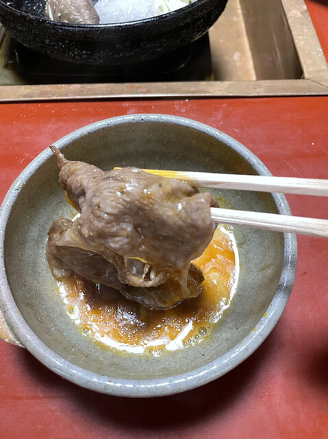 ベテランの仲居さんが手際よくまずは焼き上げてくれるお肉を溶き玉子につけて一口。