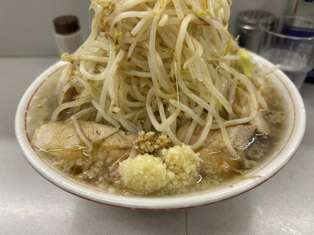 まずは、もやしからいただきます。マシマシって、こんな多いんですね本当に多くてびっくりでしたですが、麺とスープと共にいただきました。背脂もぎっしり。ちぢれ麺も、美味しいっっ!!