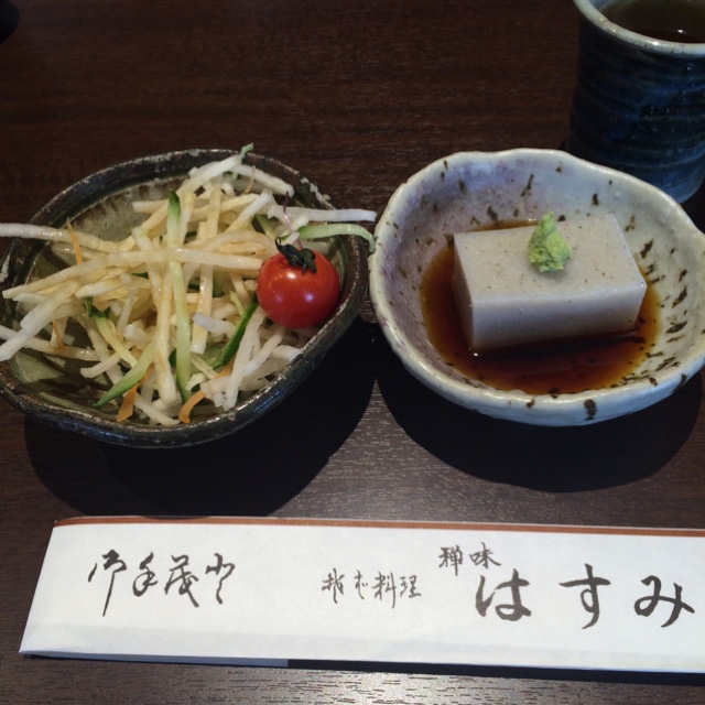 一つの小鉢は大根、きゅうり、ミニトマトのサラダで、もう一つは蕎麦豆腐だ。
