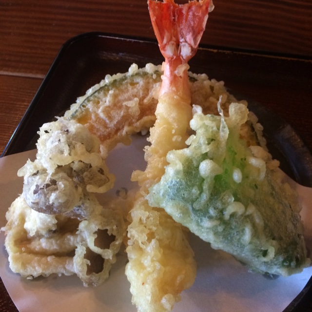 天ぷらは海老天、カボチャ天、ピーマン、舞茸、ちくわの天ぷらである。