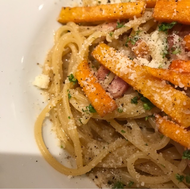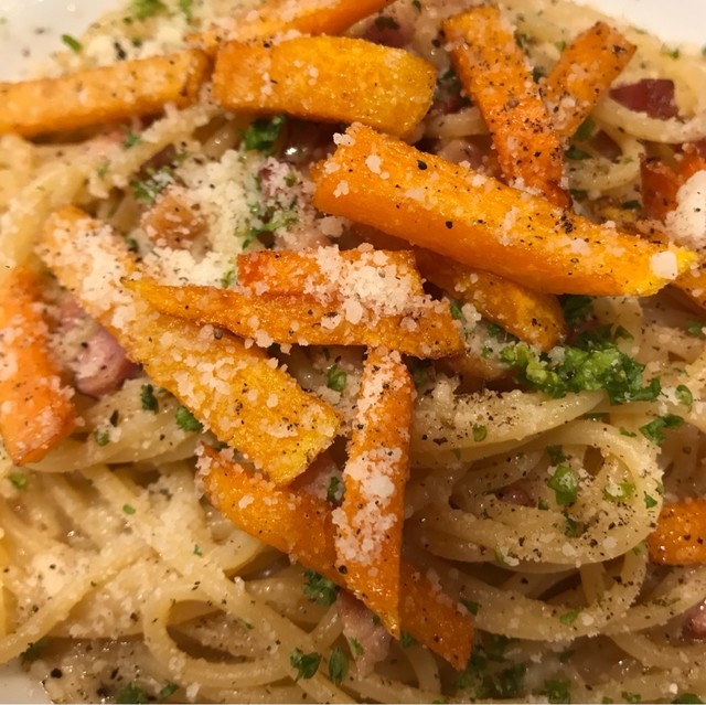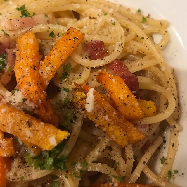 ベーコンと揚げバターナッツカボチャのチーズ風味スパゲッティ。