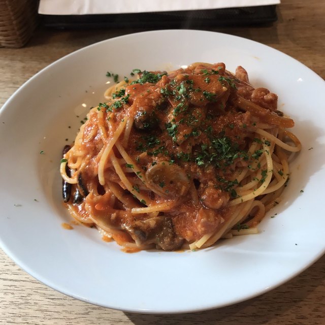 色々魚介ときのこをトマトソースでじっくり煮込んだラグースパゲティ。