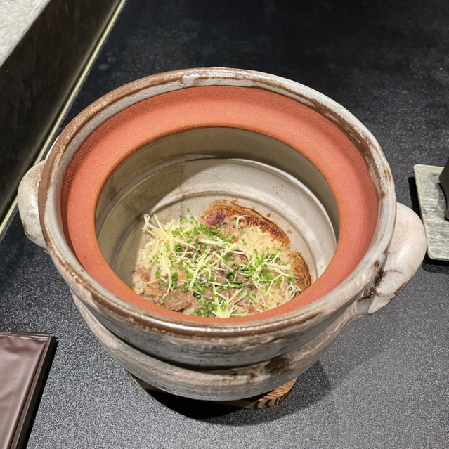 もつまぶしは、土鍋で炊かれていてホルモンの旨味がたっぷりと出ている。