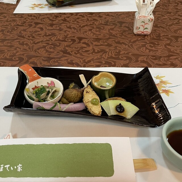 最初に出された前菜はつぶ貝、大根の酢漬け、湯葉、和物、甘味など様々な珍味であった。