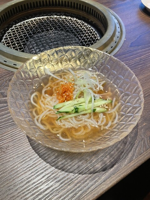 究極出汁の冷麺は、麺は白色の太麺でツルツルモチモチとしている。