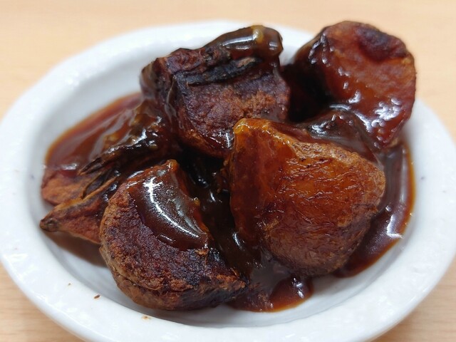 まずは「タコの桜煮」。箸で切れるほどやわらかく煮てありますが、小豆色の皮がまったくきれいな状態で付いているほど、丁寧に煮上げてありました。甘辛い醤油味の中でしっかりとしたタコの旨みと独特の風味が感じられ、旨い一品です。