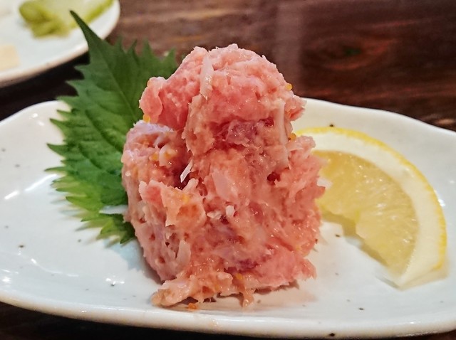 梅肉にサメ軟骨を混ぜた梅水晶とネギトロを合わせたもの。ネギトロのねっとりさと、軟骨のコリコリ、とびっ子のプチプチも楽しめる一品。さっぱりとした定番スターター。
