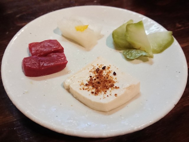 築地・吉岡屋のゴーヤの漬物とべったら漬けに、冷奴、生麩の盛り合わせ。冷奴にはボッタルガのパウダーがかかっています。