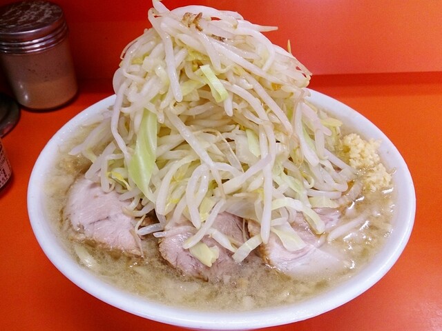 掃除の行き届いた清潔感のある明るい店内でいただけるのは、ボリュームの多い二郎においてもさらにボリュームが多いといわれる正統派の二郎ラーメン。