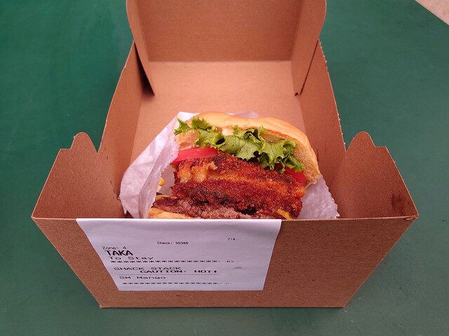 チーズバーガーとマッシュルームフライの贅沢な競演を楽しめる「Shack Stack/シャックスタック」。